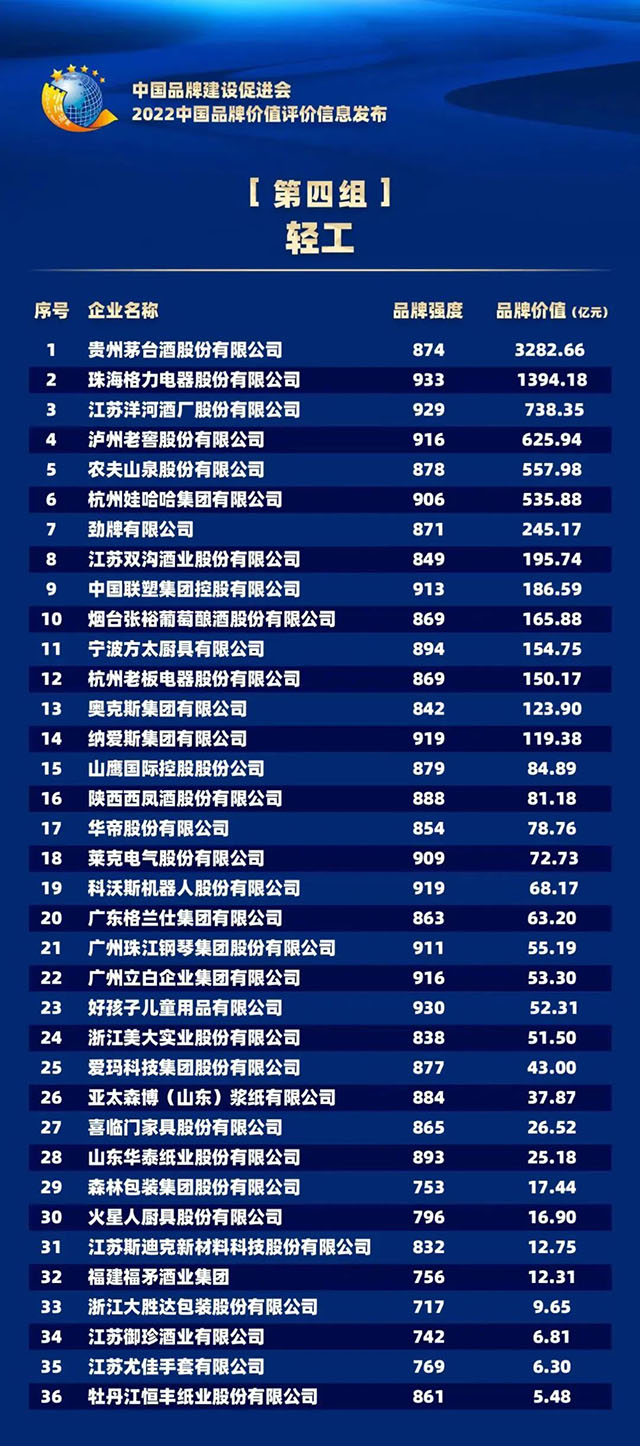 9月5日,新華社、中國品牌建設促進會、中國資產評估協會主辦,《中國品牌》雜志社等單位聯合主辦的“2022中國品牌價值評價信息發布”活動在京線上舉行,貴州茅臺以3282.66億元品牌價值,名列輕工領域第 一。