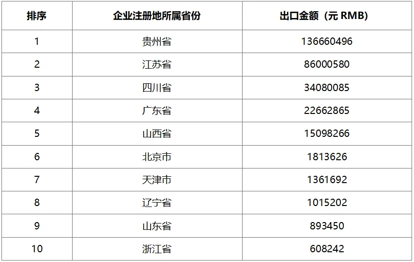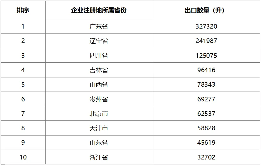 2024年6月白酒主要出口省市按數量排序