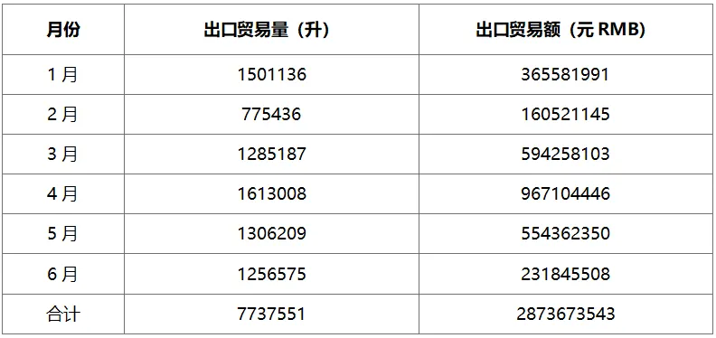 2024年1-6月白酒出口貿易量額