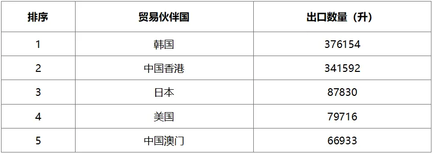 分貿易伙伴國看,6月份出口白酒貿易伙伴國多達38個國家和地區。出口數量排名前五的分別是韓國、中國香港、日本、美國和中國澳門。其中出口到韓國白酒出口量達到376千升,貿易額469萬元人民幣;排名第二香港地區,出口量342千升,貿易額8689萬元人民幣。出口白酒貿易額排名前五的貿易伙伴國分別是中國香港、泰國、美國、阿聯酋和中國澳門,貿易額合計1.50億元,占當月白酒出口貿易總額比重64.66%。