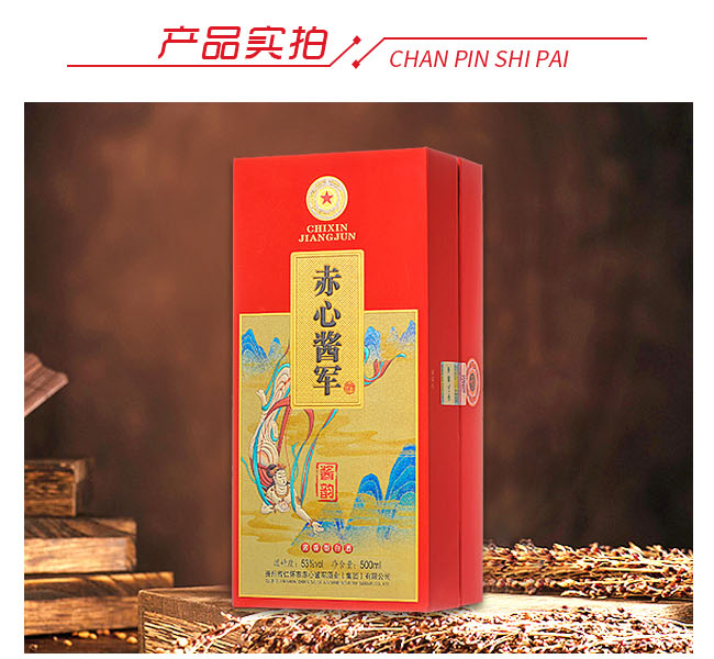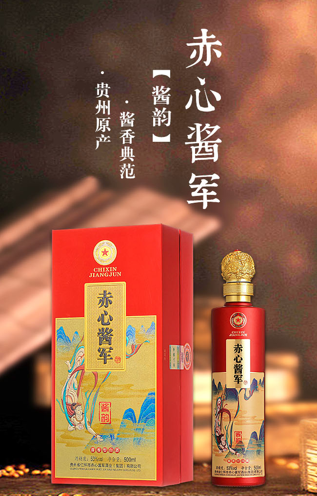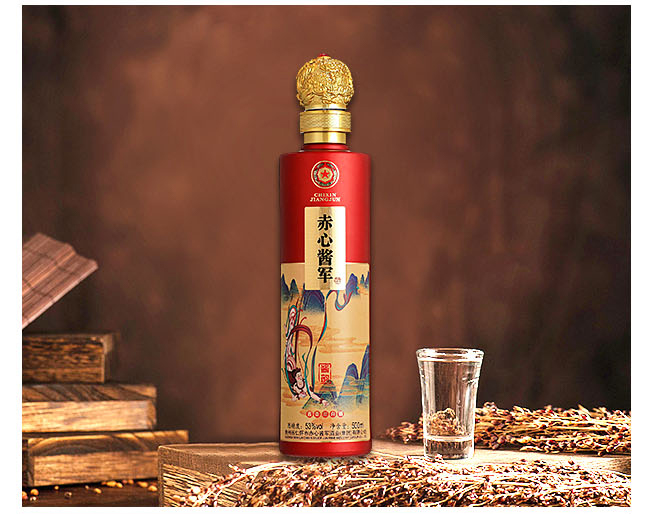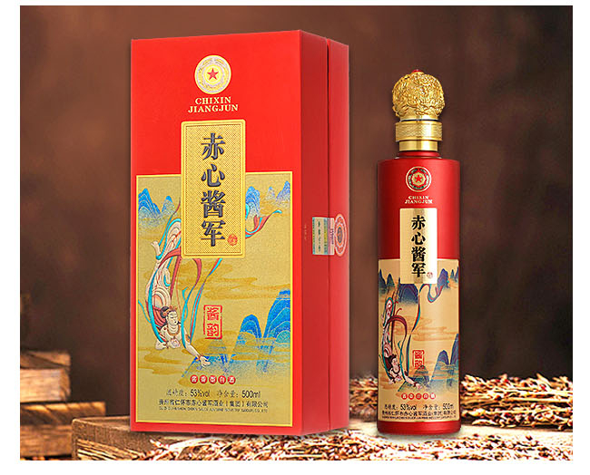 赤心醬軍酒業(集團)堅持“秉承傳統釀造工藝,傳承企業文化”的經營理念,注重酒文化與人與自然的結合,精選本地優質紅高粱、小麥,以赤水河河水為酒引,嚴格按照端午采曲、重陽投料之傳統工藝生產。通過九次蒸煮、八次堆積發酵、七次取酒,通過長期窖藏,并由集團公司總工程師精心勾兌,產品具有酒體醇厚、醬香突出、幽雅細膩、回味悠長、空杯留香之特點。