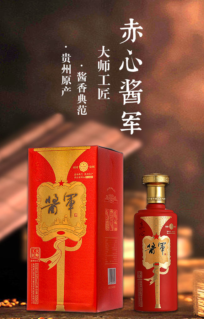 赤心醬軍酒業(集團)堅持“秉承傳統釀造工藝,傳承企業文化”的經營理念,注重酒文化與人與自然的結合,精選本地優質紅高粱、小麥,以赤水河河水為酒引,嚴格按照端午采曲、重陽投料之傳統工藝生產。通過九次蒸煮、八次堆積發酵、七次取酒,通過長期窖藏,并由集團公司總工程師精心勾兌,產品具有酒體醇厚、醬香突出、幽雅細膩、回味悠長、空杯留香之特點。