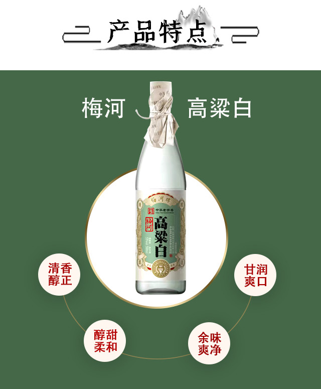 梅河高粱酒,始于公元1888年,清光緒14年,十代人歷經134年傳承發展至今,東北獨特的地理環境和作物生長,造就了原產地的美酒聞名,順應天時的自然規律,耐心等待糧食熟成,曲塊慢慢發酵,堅守釀酒匠人們對傳統技藝的執著與驕傲,采用百年老窖池,人工純糧固態發酵,窖泥中豐富的氨基酸和微生物,會使酒的香氣更加濃郁醇厚,將糧、水、曲三者調和的回味悠長,入口綿柔,唇齒留香,光緒曾贊嘆:此酒醇而不烈,甘而不過,醉而不傷,真乃佳釀也。