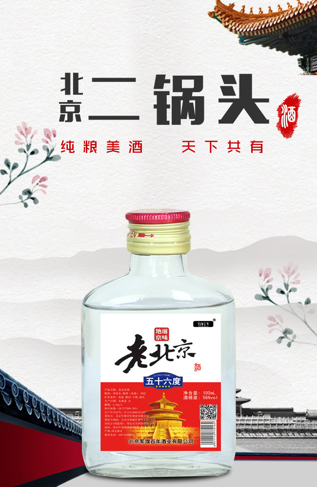 產品名:軍旗百年老北京酒56°100ml白瓶