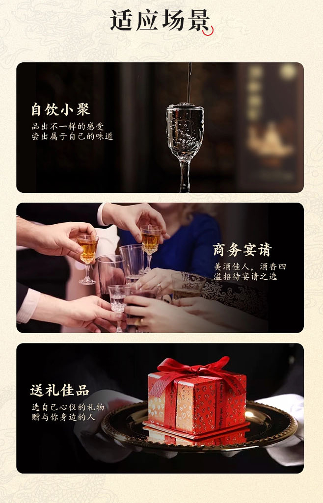 適飲場合:商務宴會、團圓小酌、婚慶宴席、節日送禮、收藏