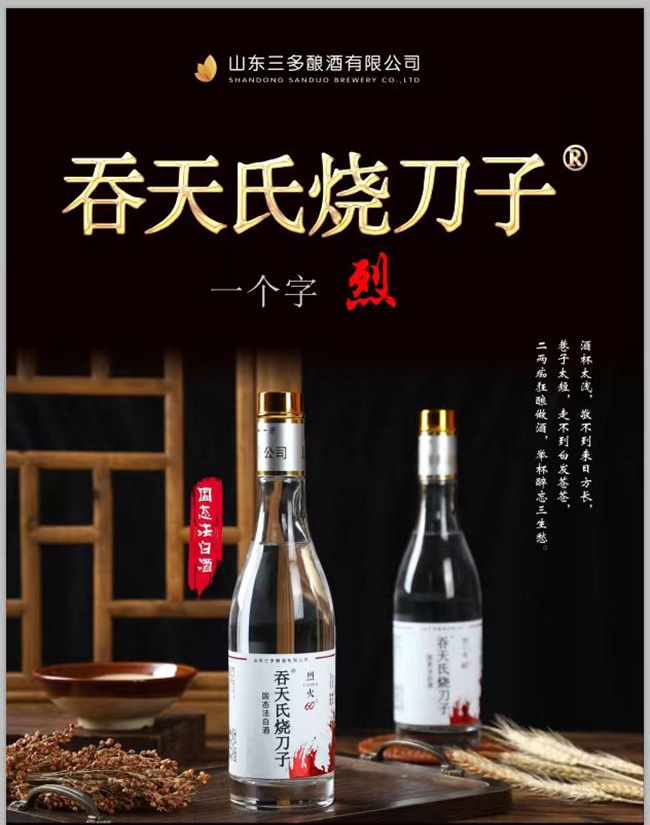 經過初步策劃開發,現主要有吞天氏燒刀子酒,薯實黑蒜酒,咕嘍咕嘍酒,地瓜燒酒、地瓜干酒等系列產品,2018年6月試運營以來深受山東及周邊多省地區人民的喜愛,并得到各同行和客戶的信任和贊譽。經典瓶形,簡單包裝,“甜、綿、軟、凈、香”的獨特風格,爭取在當今酒水品牌眾多的市場形勢下,闖出屬于我們的一片天空!