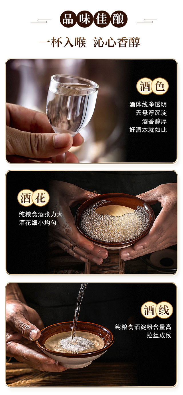善農坊糧食酒承諾每一瓶均采用傳統純糧固態發酵釀造,我們拒絕添加食用酒精、香精、綿柔劑、甜蜜素。堅持手工釀造,致力于讓消費者喝到充滿糧食香味的純正原漿。