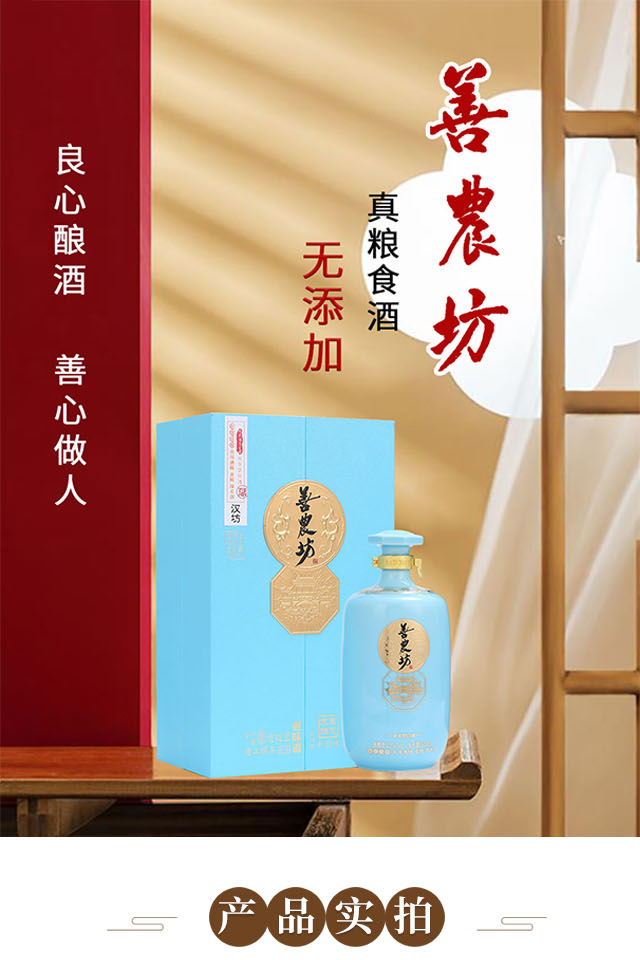 常年充足的雨水和陽光,讓高粱、小麥、大麥、玉米、豌豆等農作物綠色健康的成長,也讓深藏地下幾百米的優質礦泉源源流長;四季分明的季節氣候,給了四種不同溫酒曲發酵適合的溫床,更讓明清至今的老窖窖泥菌群活躍、歷久彌芳;忠于本真的善農坊釀酒人承繼了徽酒傳統釀造技藝,承傳古法“老窖池固態發酵”,全部采用陶壇儲存。古老的釀酒技藝,其特點就是:老窖池發酵、純糧食釀造、不添加食用酒精、香精香料及甜蜜素等添加劑。包裝返璞歸真,不取悅消費者,這種特點使產品具備了地理文化個性與民間古法傳承技藝個性。