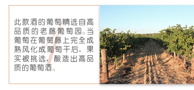 此款酒的葡萄精選自高品質的老藤葡萄園。當葡萄在葡萄藤上完全成熟風化成葡萄干后,果實被挑選,釀造出高品質的葡萄酒。