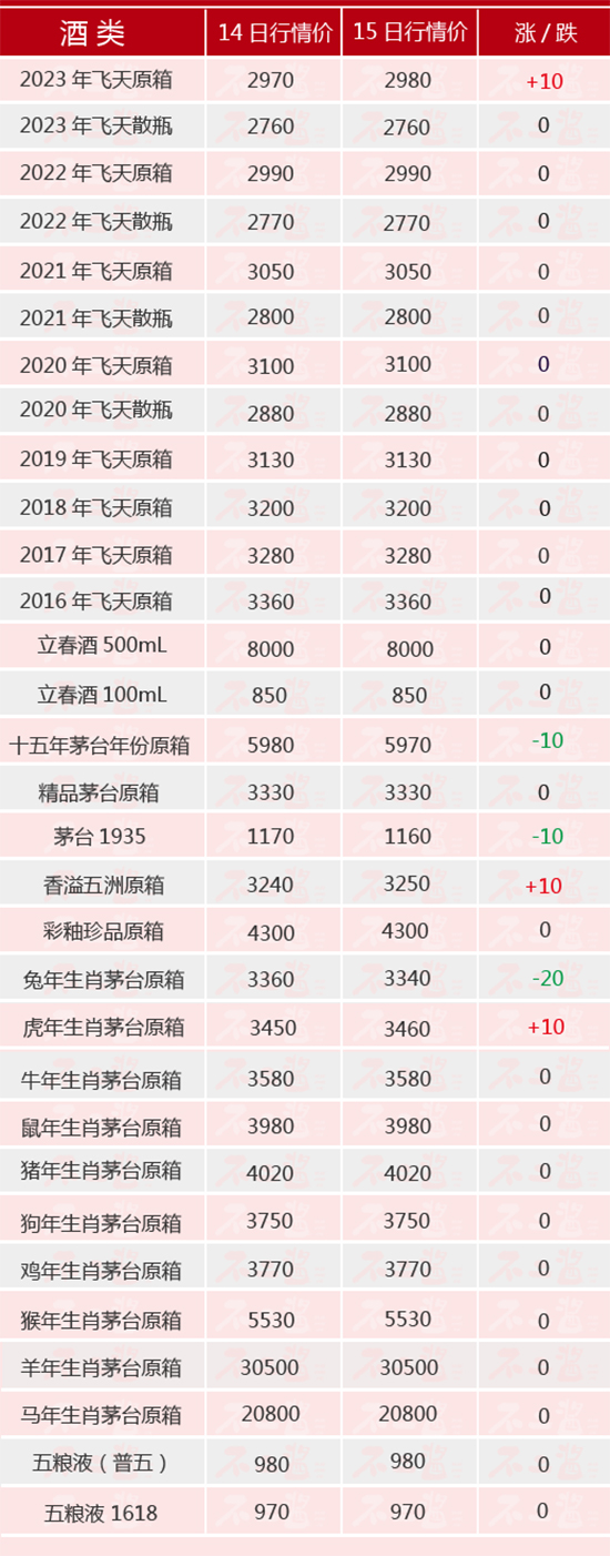 3月15日茅臺酒行情價,立春酒終于止住了漲勢。飛天方面,2023年原箱漲10元/瓶;生肖方面,兔年跌價20元/瓶,虎年漲10元/瓶;其他系列,十五年,精品茅臺、茅臺1935小跌10元/瓶,香溢五洲漲10元/瓶。